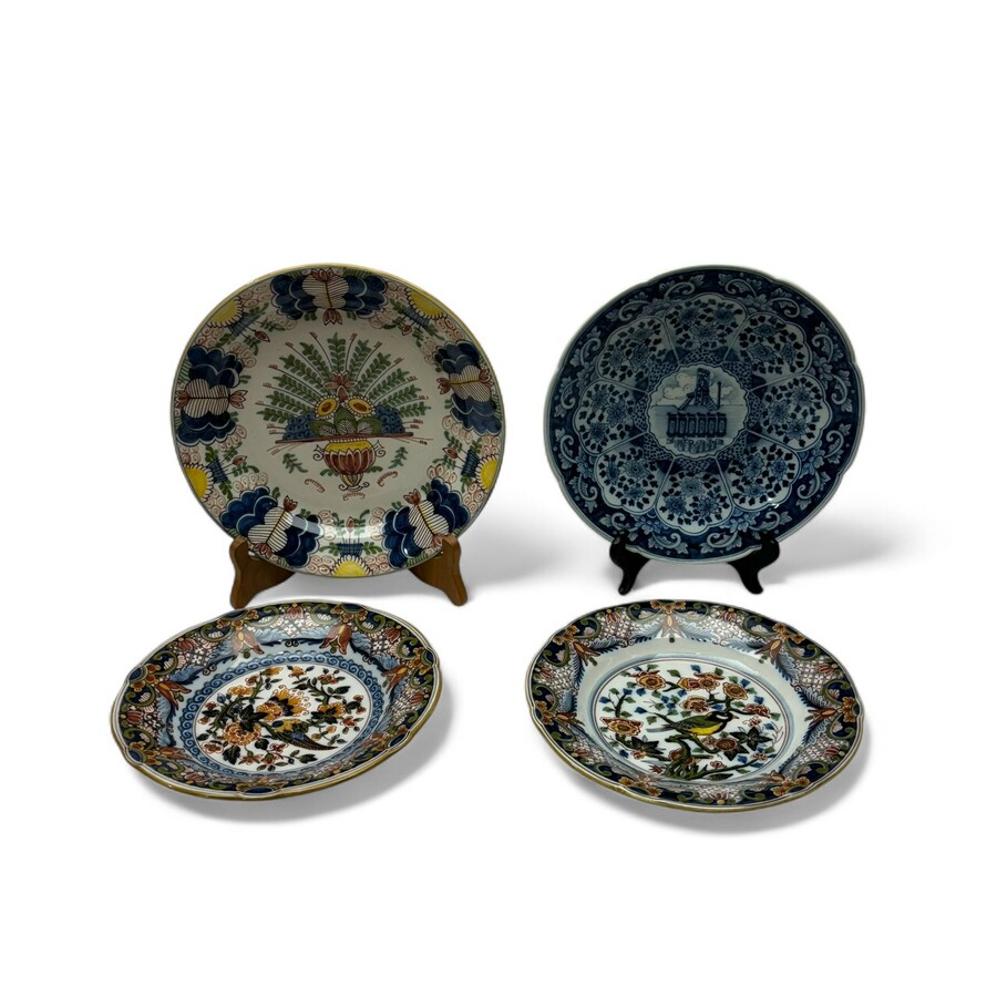 Lot met vier stuks Tichelaar, Makkum aardewerken schotels. Blauw/wit en polychroom. Met diverse decors van vogels en bloemen. 20e eeuws.