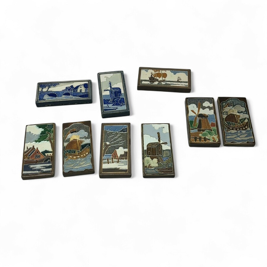 Negen kleine cloisonné wandtegels, onderwerp: landschapsvoorstellingen, waaronder molens en scheepjes op het water, alle negen gemerkt Westraven, Utrecht