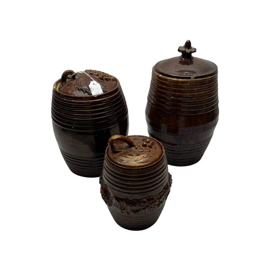 Lot van drie antieke 19e eeuwse bruingeglazuurde tabakspotten.
