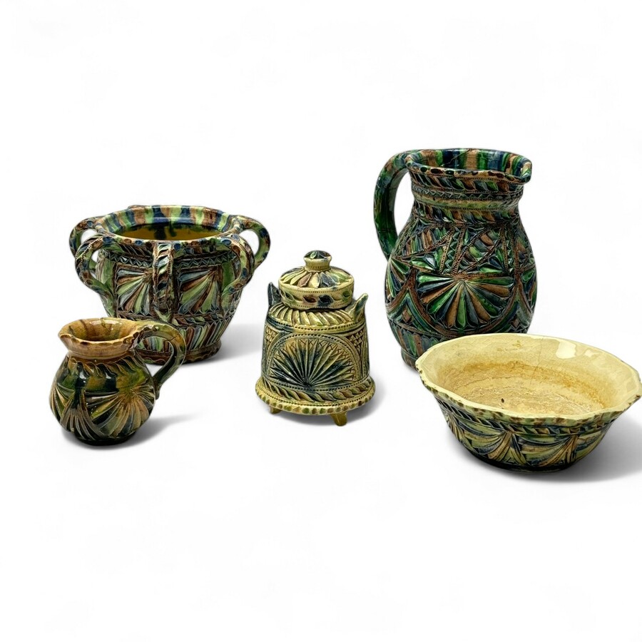 Lot divers 20e eeuws Fries kerfsnee aardewerk: grote en kleine schenkkan, kom, zevenorenpot en doofpot. Twee objecten gesigneerd 'MW' = vermoedelijk Margje de Jong-Visser, Workum.
