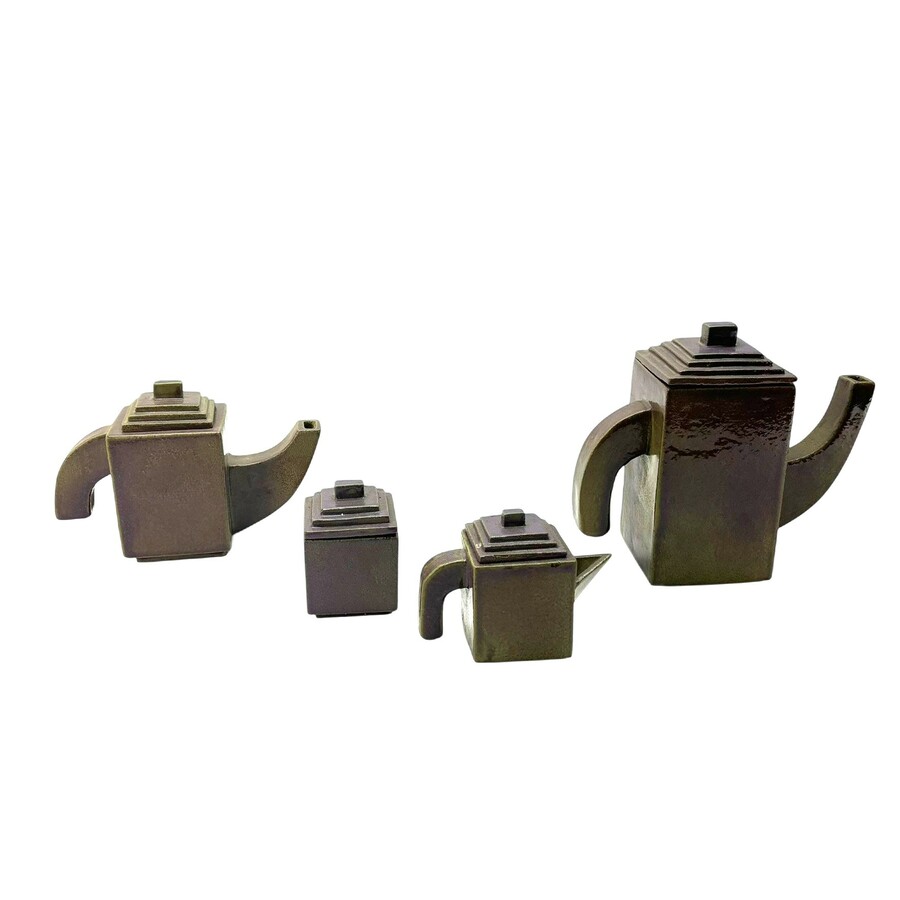Een vierdelig paars aardewerken serviesje, bestaande uit koffiepot, theepot, melkkan en suikerpot. Theepot en suikerpot gesigneerd Jan Snoeck (Rotterdam 1927 - Den Haag 2018), 2002