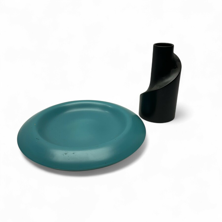 Lot van twee stuks keramiek: een zwartgeglazuurde vaas, ontwerp Jan van der Vaart voor Oar Wurk Makkum. Met daarbij een turqoise blauwe schaal, ontwerp Marcel Wanders voor Oar Wurk Makkum.