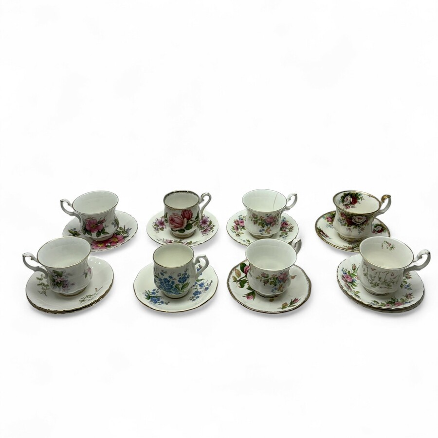 Lot van tien schotels en acht kopjes, allen Royal Albert. Diverse decors, waaronder Prairie Rose, Mayflower, Nordic Flower en Forget-Me-Not