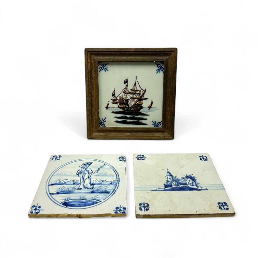 Lot van drie tegels, waaronder een antieke tegel met landschapsdecor en een 20e eeuwse polychrome scheepstegel, Tichelaar Makkum.