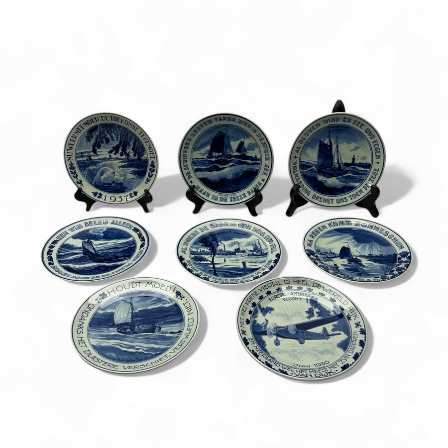 Lot van acht 20e eeuwse blauw-wit beschilderde aardewerken crisisborden, Porceleyne Fles. Diverse jaren: 1930, 1931, 1932, 1933 (2x), 1934, 1935 en 1937.