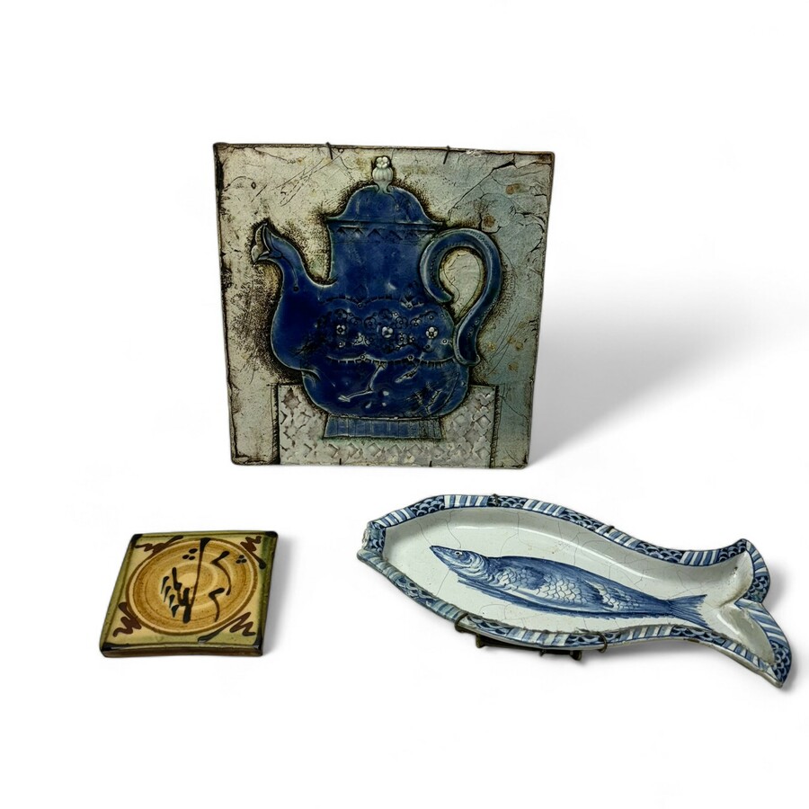 Lot divers keramiek: een 20e eeuwse geglazuurde plaquette met afbeelding van een theepot, gesigneerd Marta Tabergora, een kleine tegel, gesigneerd Niek Hoogland, en een blauw-wit haringschaaltje...