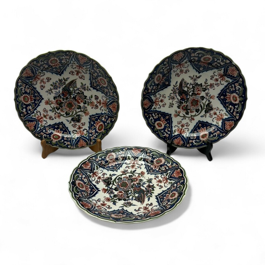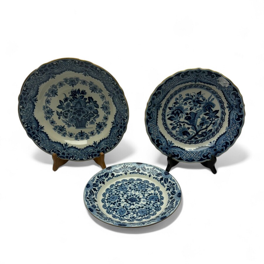 Lot van drie stuks Tichelaar, Makkum aardewerk. Bestaande uit drie schotels. Blauw/wit met florale en vogeldecor. Alles gemerkt Tichelaar, Makkum.