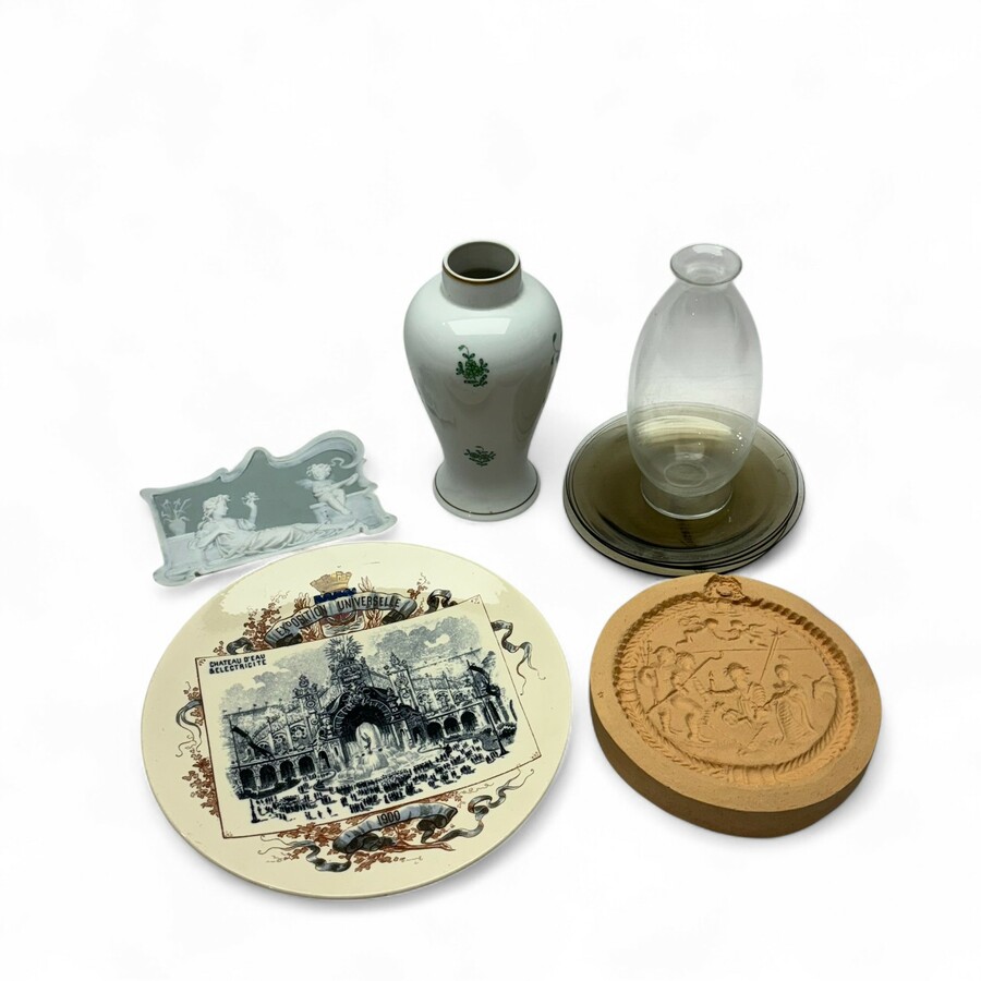 Lot met divers plateel, aardewerk, porselein en glas. Bestaande uit een vaas van Zuid Holland, Leerdam karaf van Berlage, vorm van Tichelaar Makkum en een souvenir schotel van de Wereld tentoons...