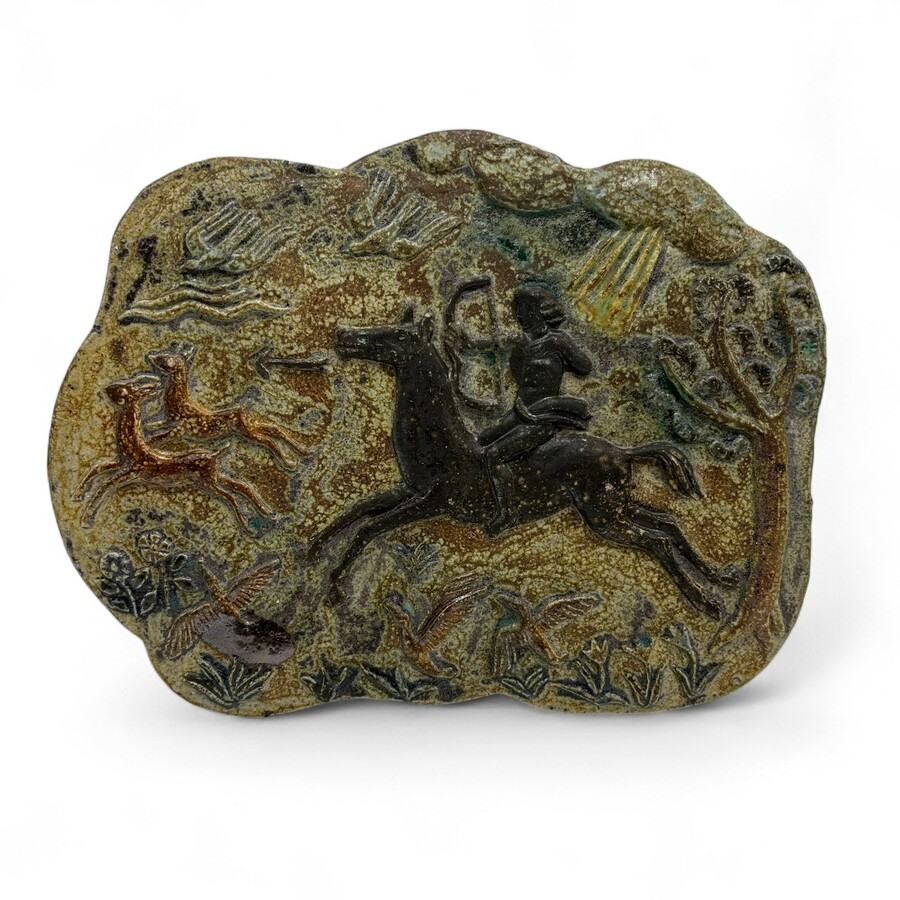 Een 20e eeuwse keramieken plaquette, voorstelling van een boogschietter te paard met daaromheem diverse dieren. Terraco, Beesel