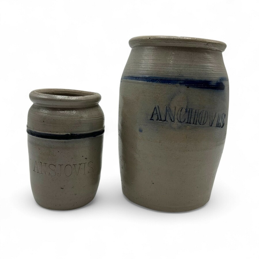 Lot van twee Keulse potjes met opschrift ‘Anchovis’ en ‘Ansjovis’.