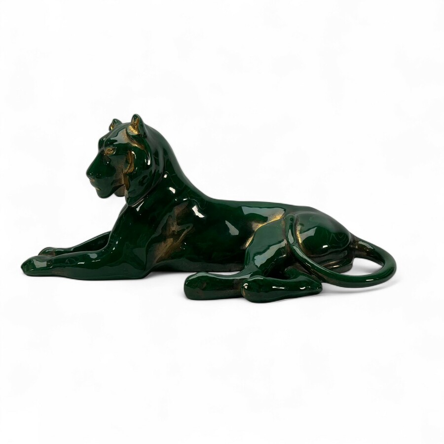 Een Frans aardewerken groen geglazuurde sculptuur van een liggende leeuw, 38 cm lang x 17 cm hoog. Gemerkt voor Saint Clément, model 8587. Ca 1930. Gaaf