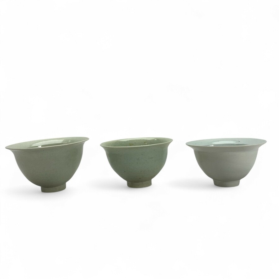 Drie steengoed kommen op smalle voet, 12 en 14 cm doorsnede. Voorzien van een celadon glazuur. Gemerkt met anker. Moderne keramist.