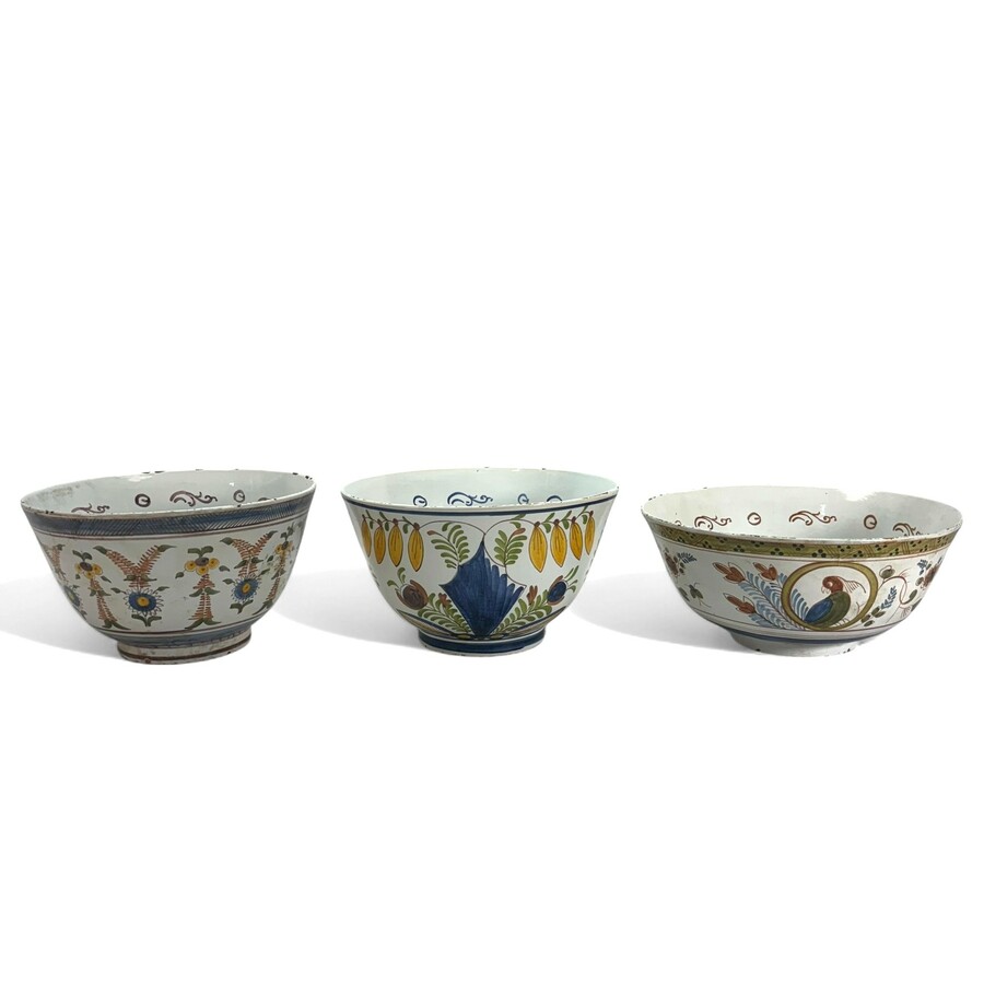 Lot van drie 19e eeuwse Delfts aardewerken kommen, polychroom gedecoreerd met decor van bloemen en vogels. Gesigneerd met diverse monogrammen.