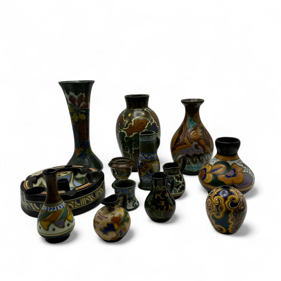 Waaronder vaas met druivendecor 'Princess Ivora', gemerkt en uitvoering Plateelbakkerij Gouda, en asbak, gemerkt en uitvoering Koninklijke Goedewaagen, Gouda, alle eerste helft 20e eeuw