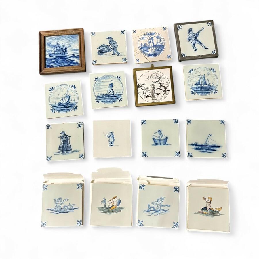 Lot van zestien diverse tegels. Veel Tichelaar Makkum, o.a. met voorstelling van het schip Poolzee, een sollicitatietegel, een troubadour (vermaakt tot onderzetter), één met Oosters decor.