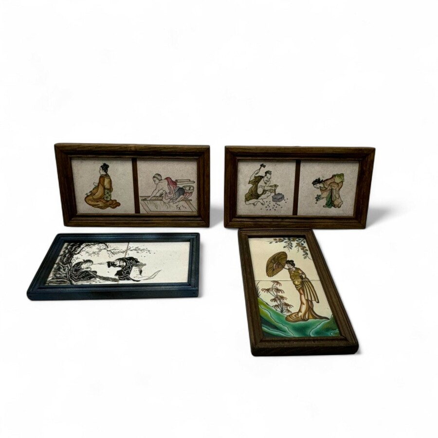 Lot van vier lijstjes, twee met tweepas tegeltableau. Eén polychroom met parasoldame, gesigneerd Tineke Fahner (1942-2025), één zwart-wit, op achterzijde gemerkt Tichelaar Makkum. En vier tegels...