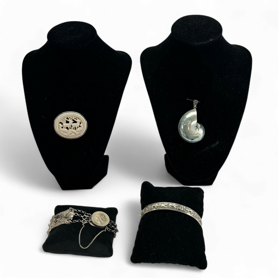Lot diverse zilveren sieraden: een antieke armband gemaakt van een 19e eeuws Bijbelslot, met Willem III munt als slot, een tweede gehalte (835/1000) zilveren slavenarmband met decor van salamand...