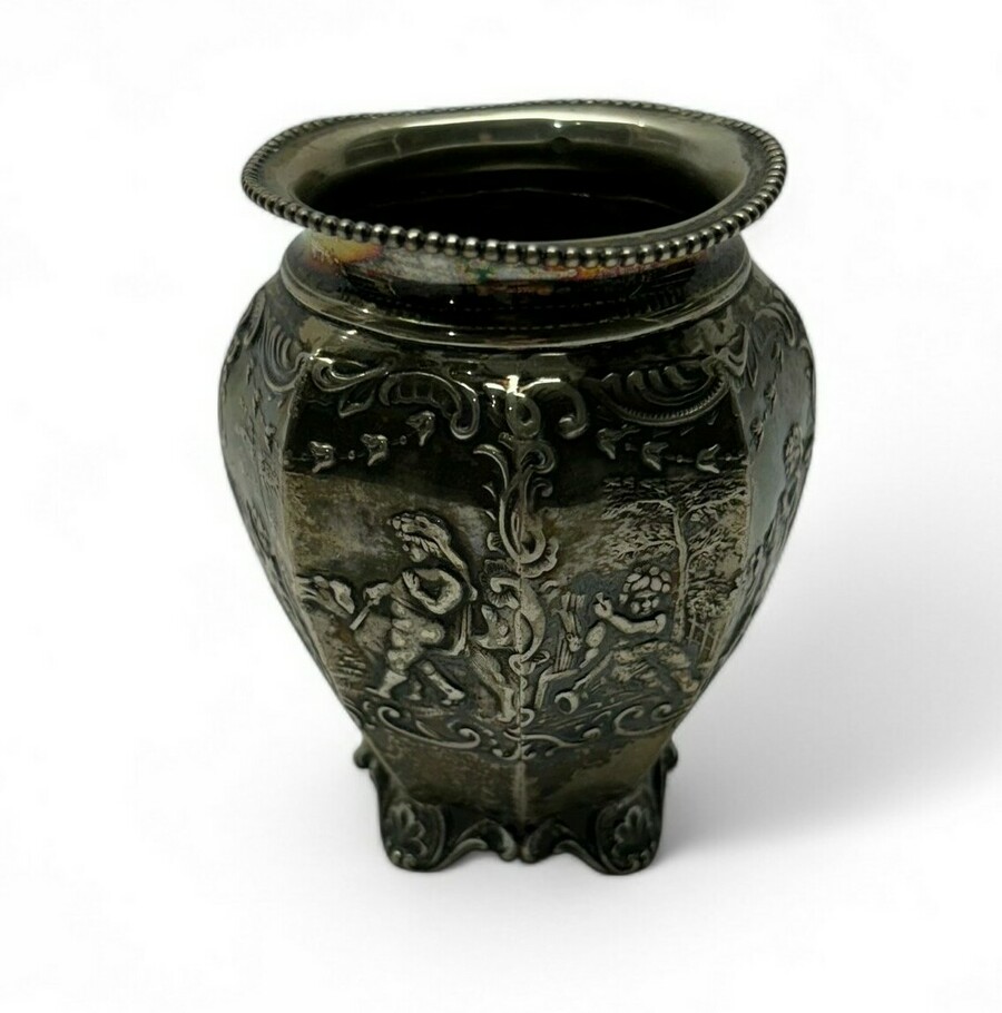 Een antiek Hollands tweede gehalte (835/1000) zilveren lepelvaasje, achtkantig model met voorstelling van putti’s. Aan de onderzijde gemerkt.