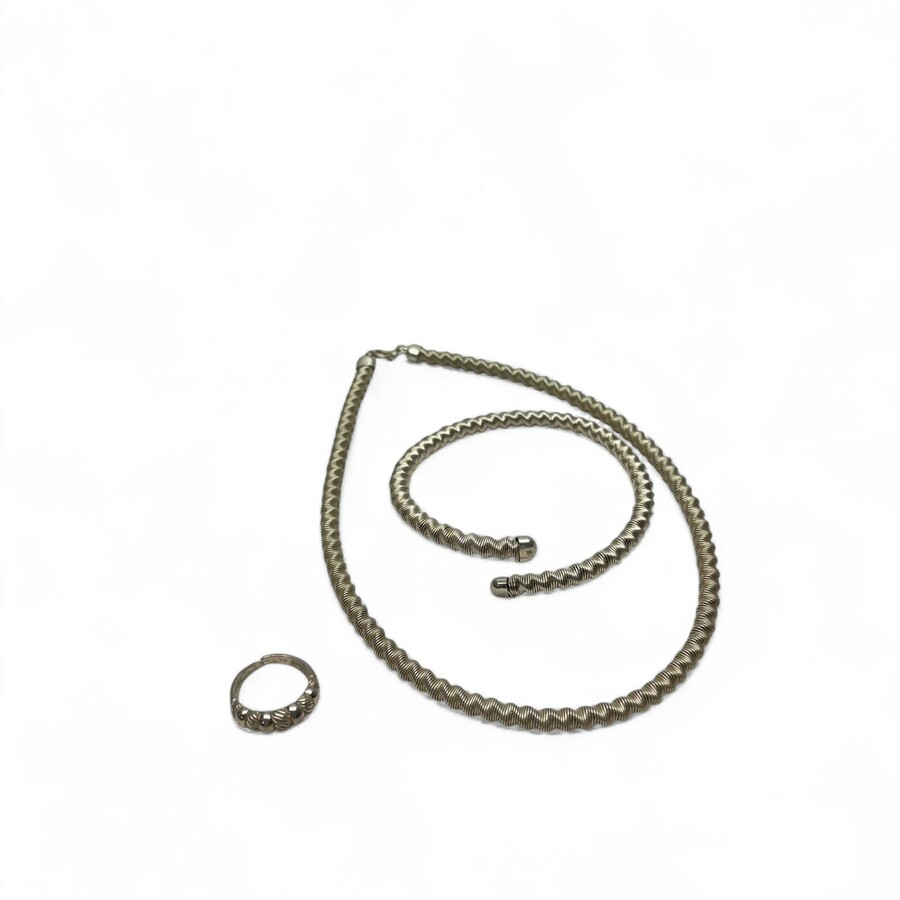 Een moderne 20e eeuwse tweede gehalte (835/1000) zilveren sieradenset, bestaande uit collier, armband en ring.