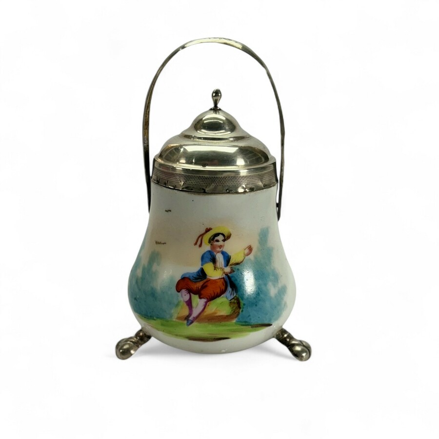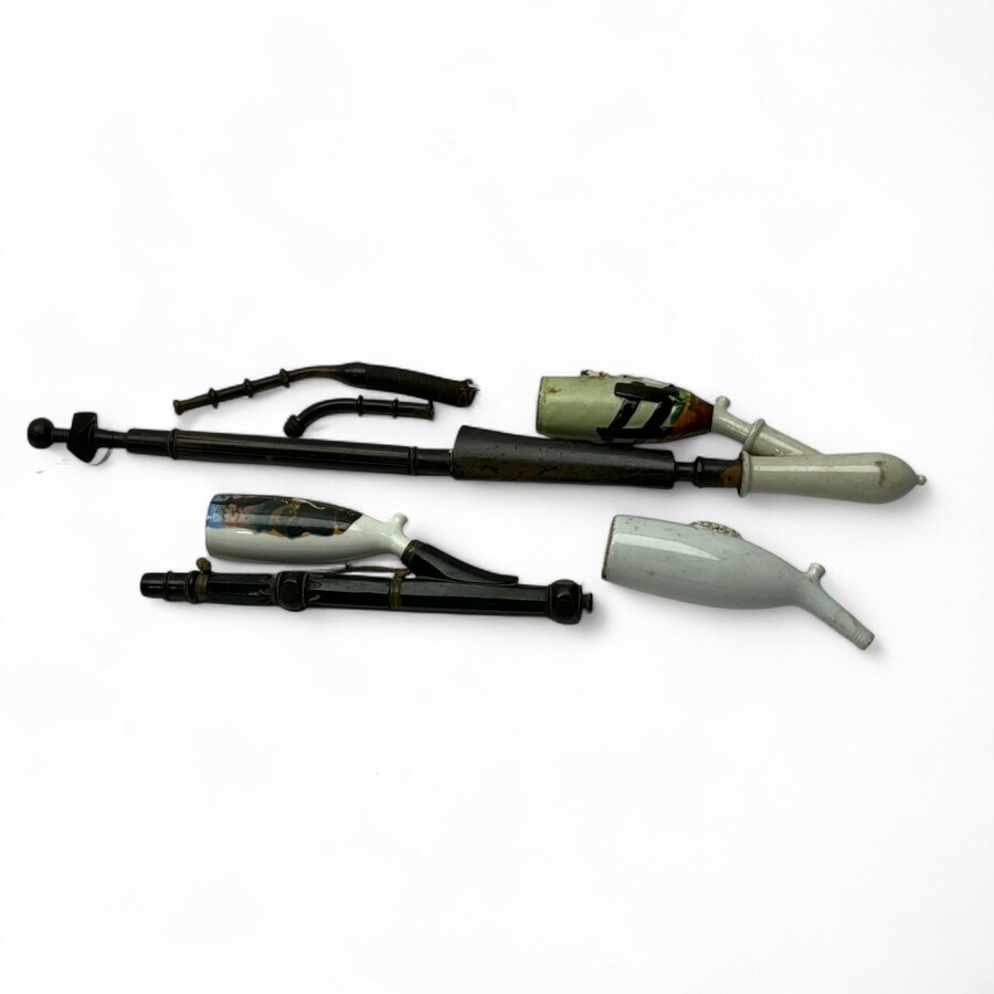 Lot diverse antieke 19e eeuwse Duitse porseleinen pijpenkoppen, met enkele onderdelen. Eén met voorstelling van jager met jachthond, één met reliefdecor van soldaat op paard en één met portretme...