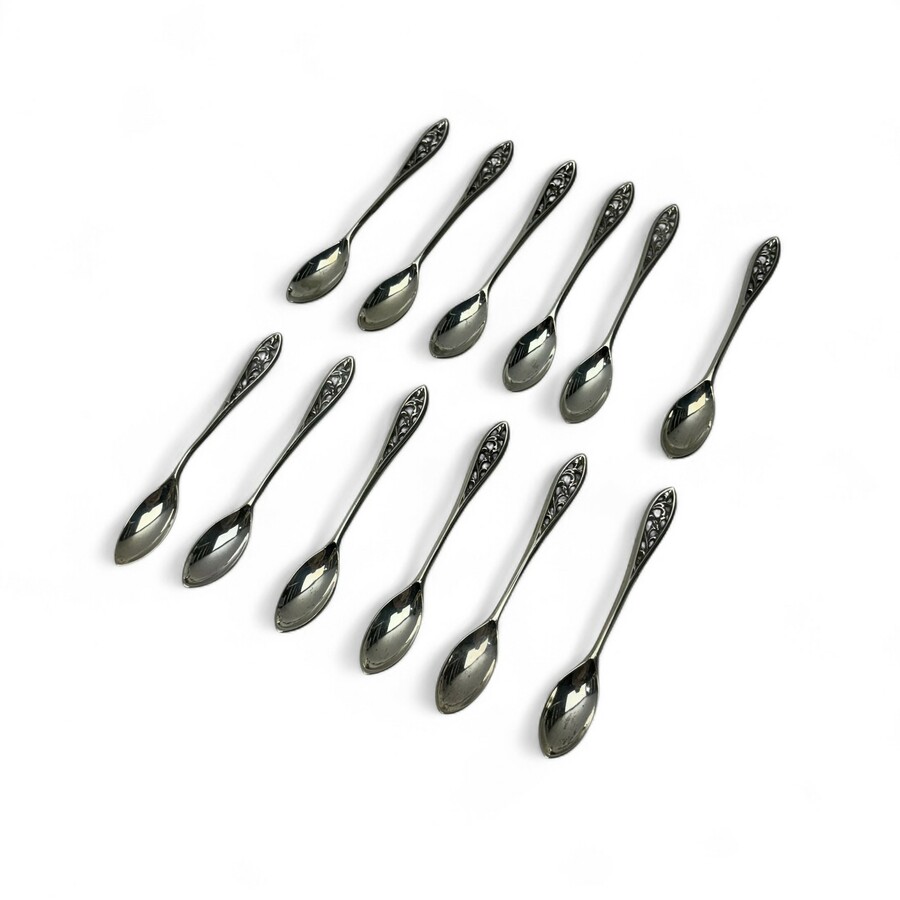 Een set van twaalf 20e eeuwse tweede gehalte (835/1000) zilveren advocaatlepeltjes, met opengewerkte steel. Gemerkt met zwaardje en meesterteken Z/Z = Zaanlandse Zilversmederij