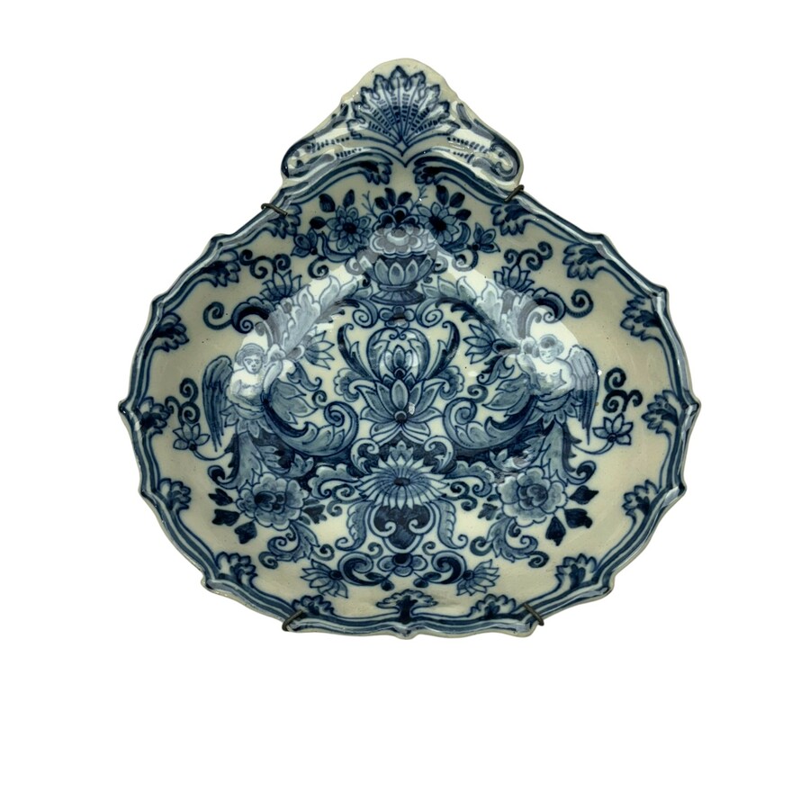 Een 20e eeuwse blauw-wit aardewerken schaaltje. Schelpvormig, met gecontourneerde rand en beschilderd in Louis XIV stijl. Aan de achterzijde gemerkt Tichelaar Makkum.