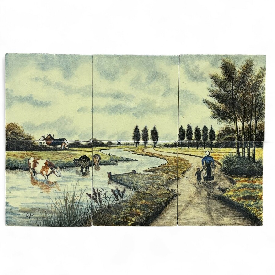 Een 20e eeuws zespas tegeltableau, voorstelling van een landschap en vaart met koeien. Gesigneerd, op de achterzijde gemerkt.