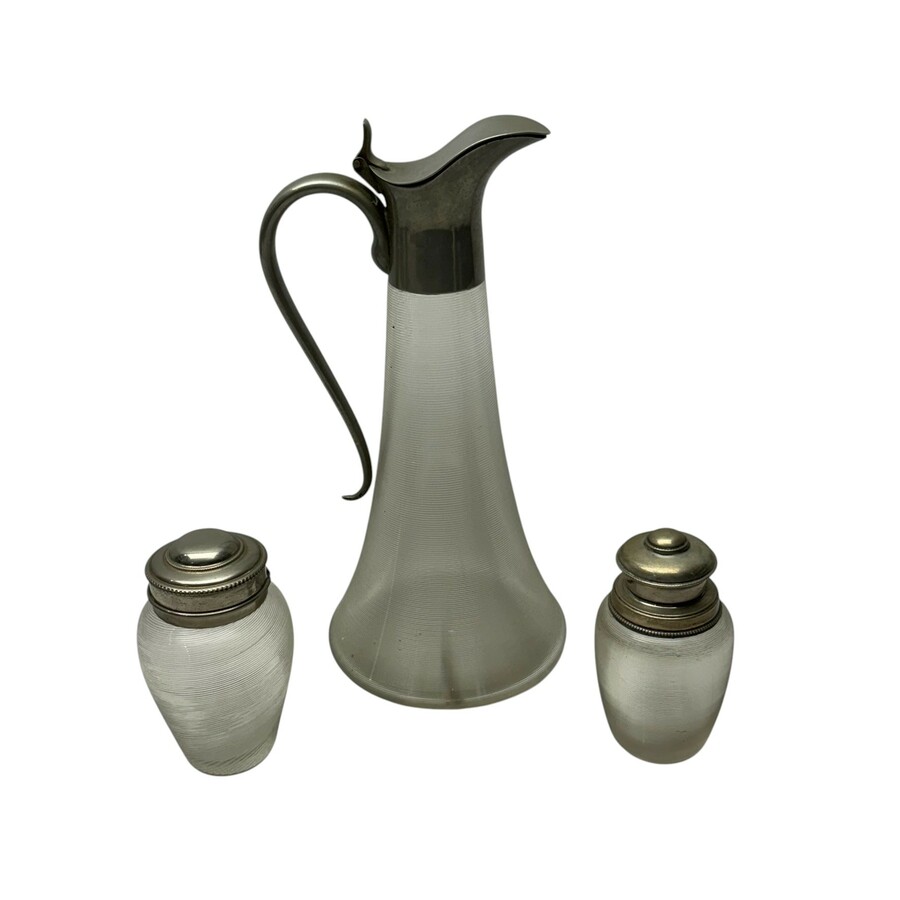 Lot van drie stuks Fries draadglas: een schenkkan met nikkelen montuur en twee theebussen, waarvan één met een zilveren montuur.