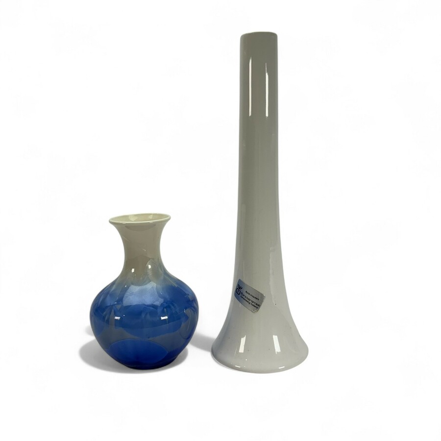 Een porseleinen baluservaasje, 14 cm hoog. Voorzien van een blauwe glazuur met ijsbloemen. Ontwerp en uitvoering Willy van Bussel (Geb 1951). Hierbij een wit geglazuurd aardewerken design pijpva...