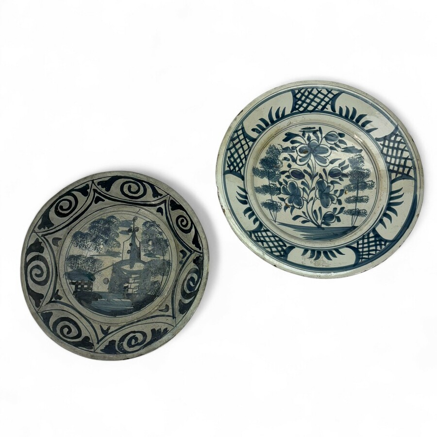 Twee 17e eeuwse Friese of Hollandse majolika schotels, 27 en 30 cm doorsnede. Blauw/wit met een decor van een kerk in landschap en floraal. Beide zijn bodemvondsten uit de omgeving Haarlem. Gere...