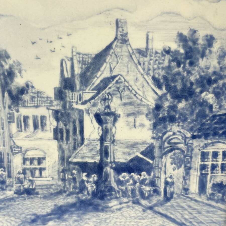 Een 19e eeuwse tegel in lijst, . Blauw/wit met een afbeelding van een dorpsplein met pomp en diverse figuren. Gesigneerd N. v/d Broeke 1889. In een originele lijst uit de periode.