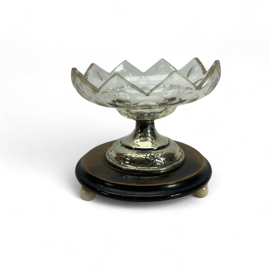 Geslepen kristallen bonbonnière op zilveren voet, staand op geschulpt gezwart houten basementje met benen pootjes