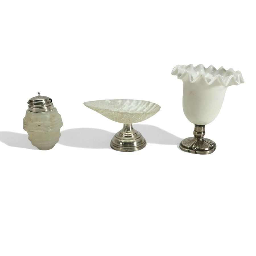 Kristallen zoutvaatje op zilveren voet en opaline mosterdpot met zilveren deksel en lepel. Met daarbij een opaline lepelvaas, tevens op zilveren voet.