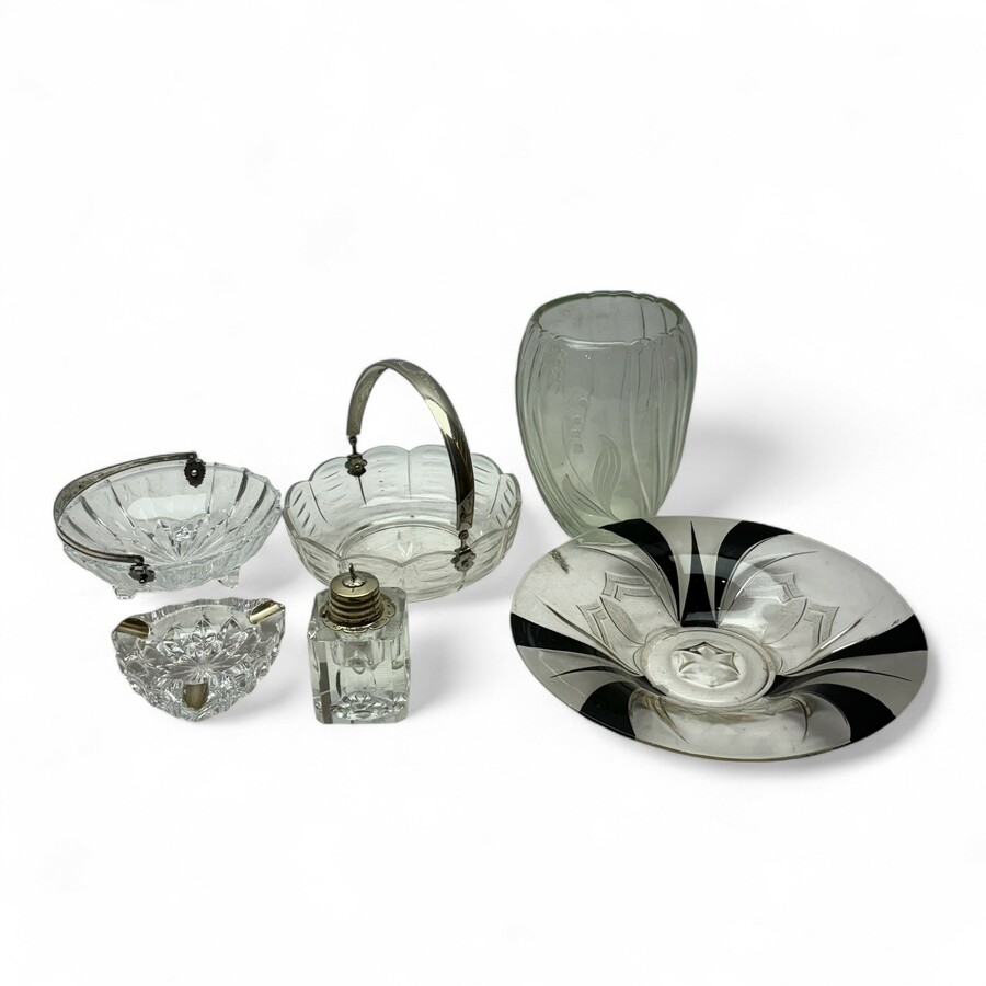 Lot met diverse glaswerk, enkele met zilver en verzilverde applicaties. Bestaande uit inktpot, asbak, schalen met beugels en een persglazen vaas en schaal.