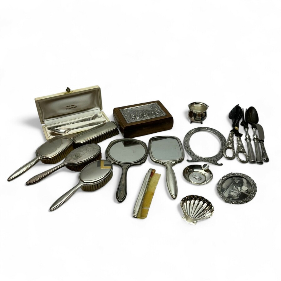 Lot met divers verzilverde artikelen, handspiegel, couvert in doos, fotolijst, asbakje, sigarenkist met plaquette etc.