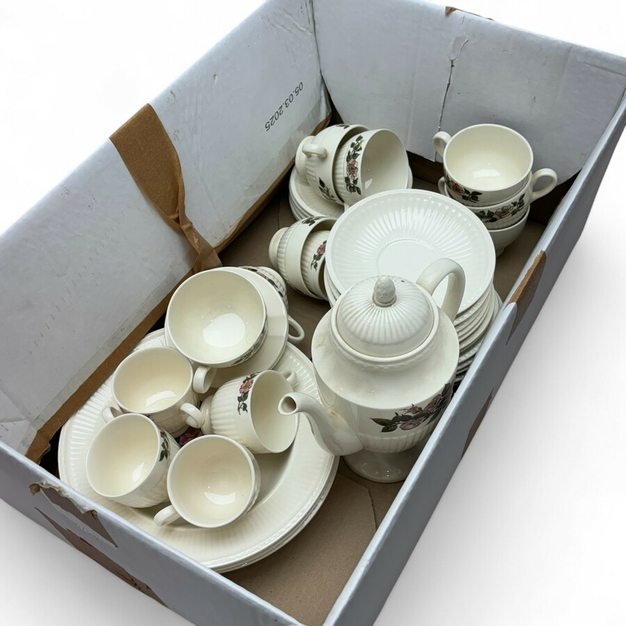 Deel van een aardewerken Wegdwood "Brair rose" ontbijtservies. Bestaande nuit kop en schotels, koffiepot, schotels etc.