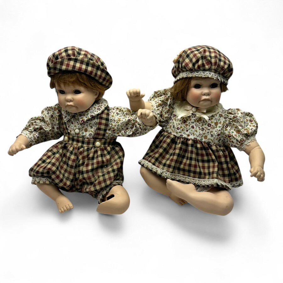 Paar poppen, beide gekleed in geruite pakjes met gebloemde blousejes: 'Hans' & 'Lotte', de hoofden en ledematen van porselein, beide: gemonogrammeerd 'JKL', uitvoering ongemerkt, gedateerd 1...