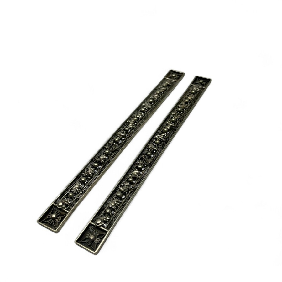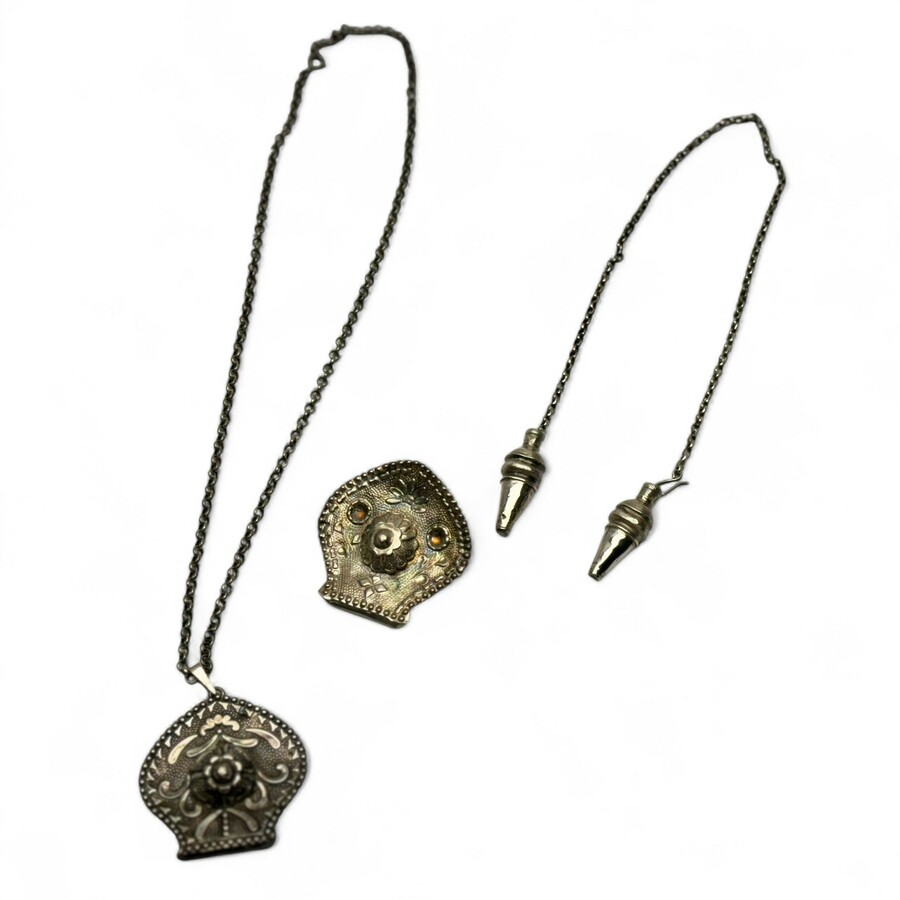 Lot van twee antieke 19e eeuwse tweede gehalte (835/1000) zilveren oorijzerknoppen, één vermaakt tot hanger aan jasseroncollier, één vermaakt tot broche. Met daarbij een set van twee tweede geha...