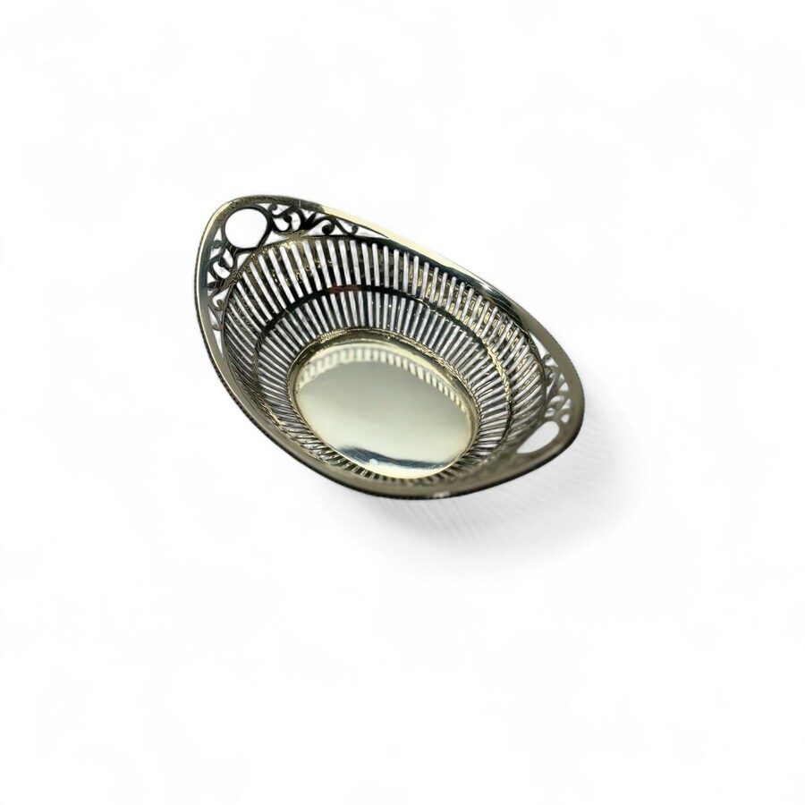Een 20e eeuws tweede gehalte (835/1000) zilveren bonbonmandje. Schuitvormig model, ajour gezaagd en met parelrand. Meesterteken 'H+P' = Fa. Presburg, Haarlem (1924-1932), Jaarletter T (1929).