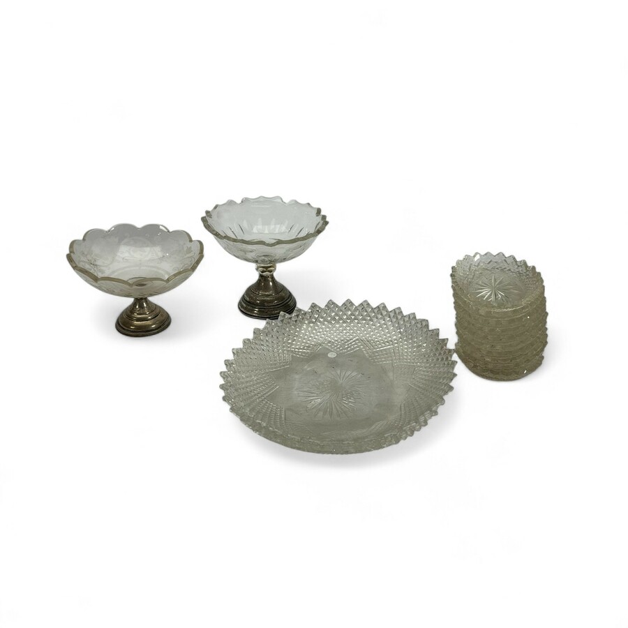 Lot divers kristal, waaronder: twee grote schaaltjes, drie onderzetters, en twee schaaltjes op 2e gehalte (835/1000) zilveren voet.