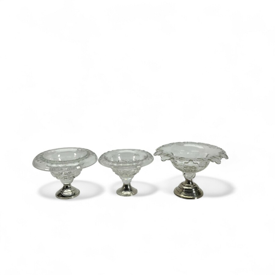Drie 20e eeuwse kristallen bonbonnieres, met ruit- en amandelslijpsel, op tweede gehalte (835/1000) zilveren voet.