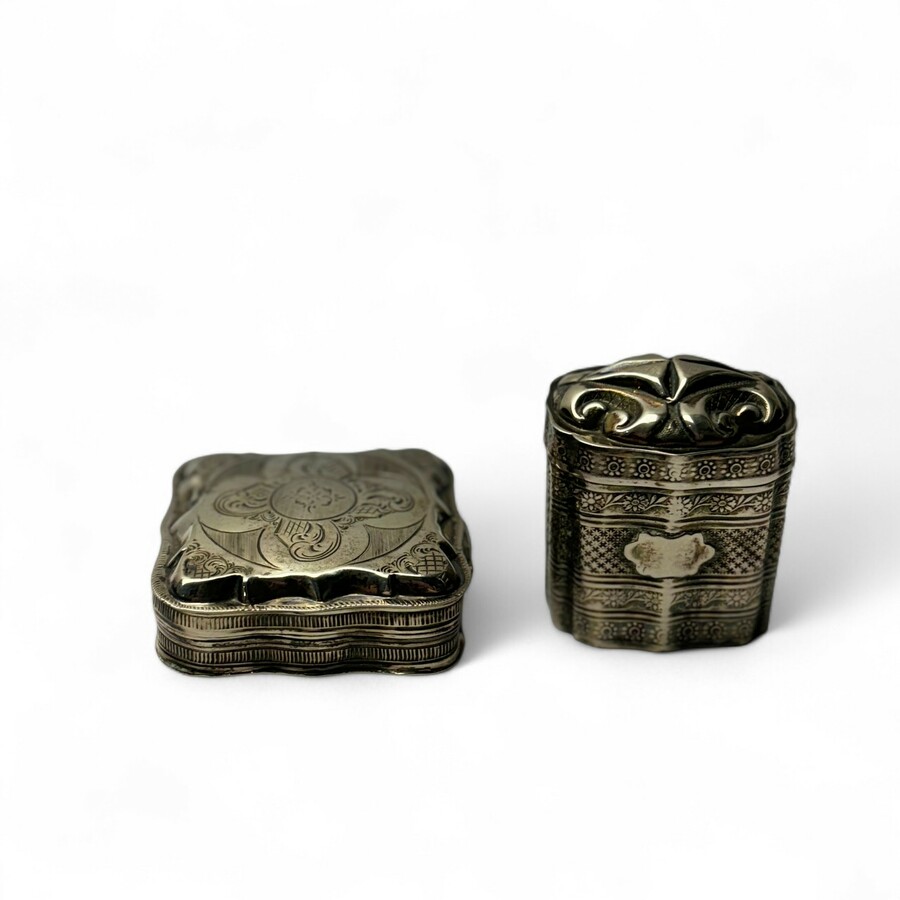 Lot: een antiek 19e eeuws tweede gehalte (835/1000) Nederlands zilveren lodereindoosje, gecontourneerd model, meesterteken 10R = Reitsma, Heerenveen (1859-1892). Met daarbij een 19e eeuws peperm...