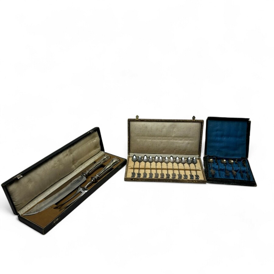 Een 3e gehalte (800/1000) zilveren voorsnij couvert, achttien BWG Djokja lepeltjes. In geschenkdozen.