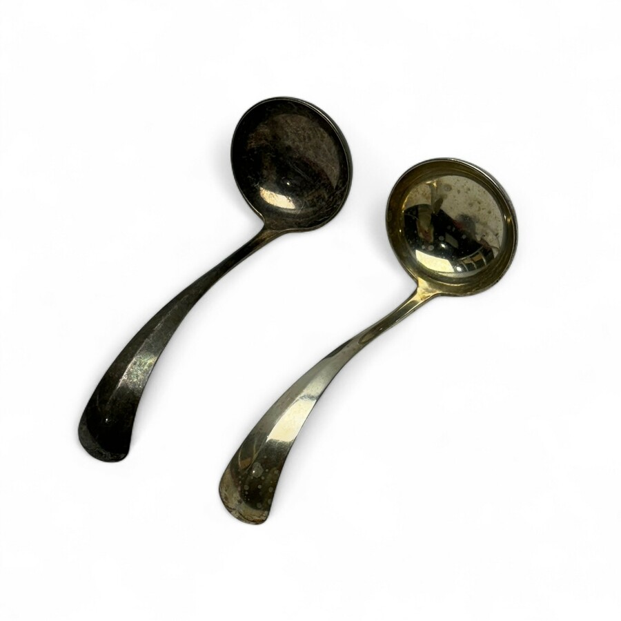 Lot van twee antieke 19e eeuwse tweede gehalte (835/1000) zilveren juslepels, Haags Lof model. Gemerkt met lopende leeuw, minervakopje, meesterteken van Kempen en jaarletter.
