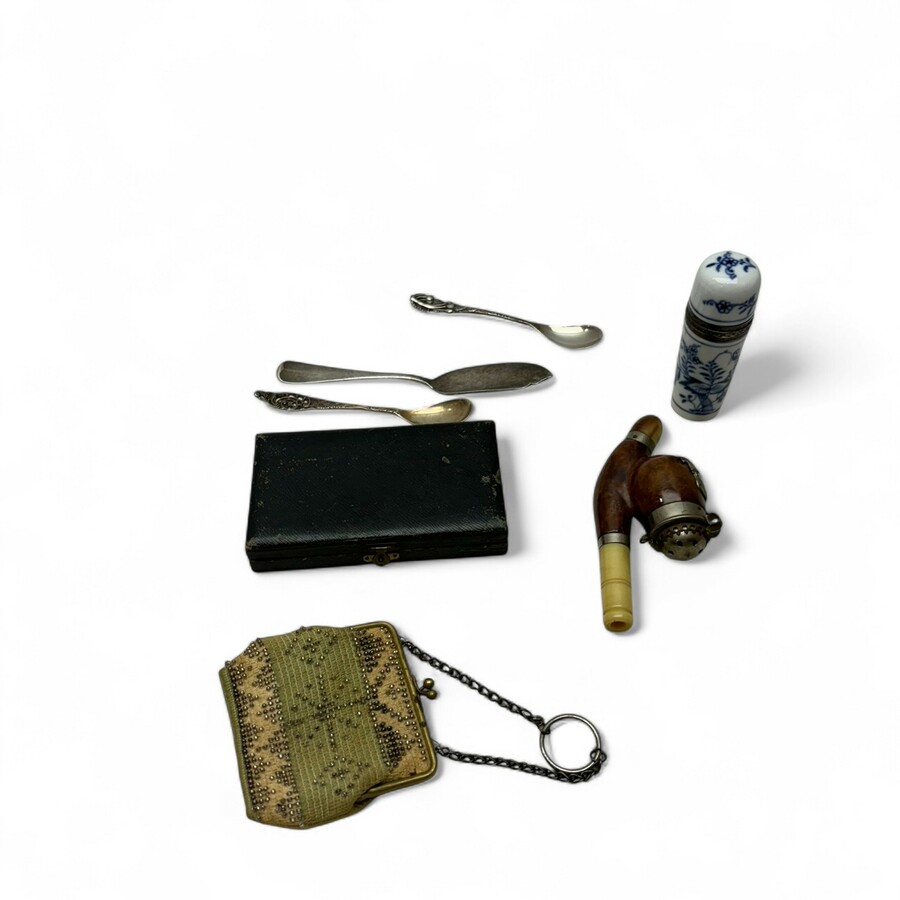 Lot diversen: een setje derde gehalte (800/1000) zilveren tafelnummers, Zwiebelmuster parfumflacon, Duits pijpje, beursje met muntjes, Haags Lof tweede gehalte (835/1000) zilveren botermesje, Vo...