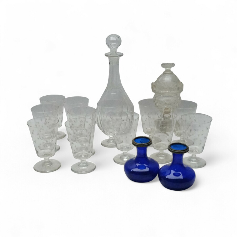 Lot kristal, bestaande uit twaalf kristallen glazen met sterslijpsel, kristallen coupe, karaf en twee blauw glazen flesjes met zilveren rand.