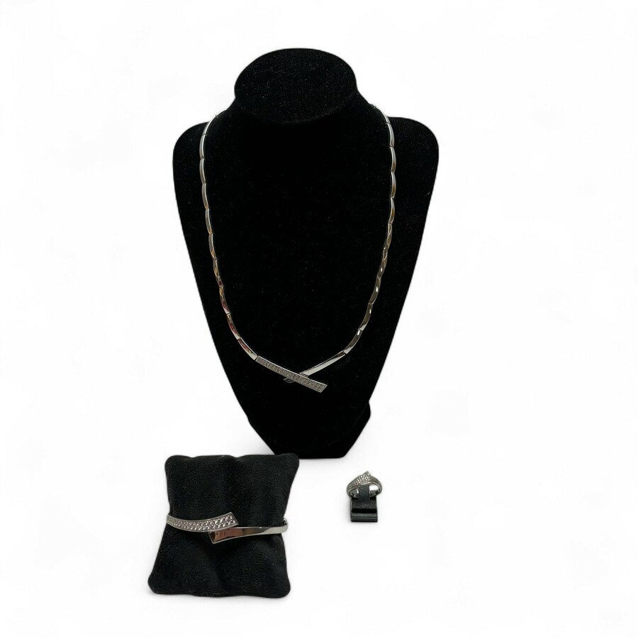Een moderne eerste gehalte (925/1000) zilveren sieradenset, bestaande uit collier, armband en ring.