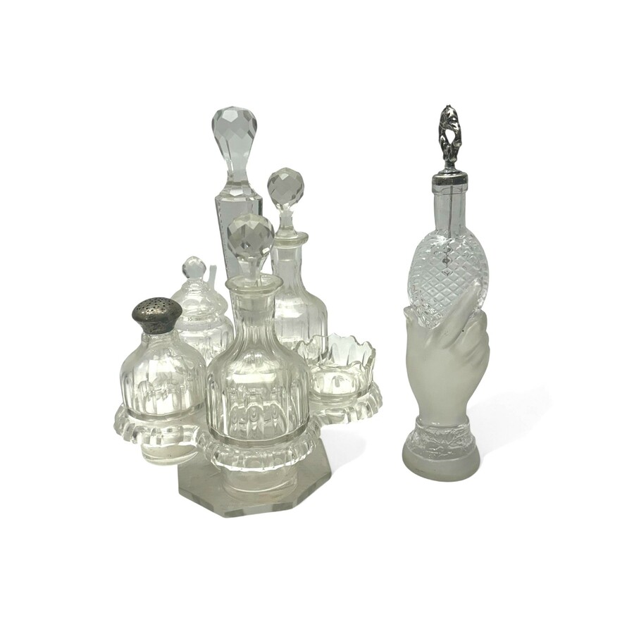 Een antiek kristallen olie en azijnstel en een parfumfles in de vorm van een hand. Met een tweede gehalte (835/1000) zilveren stop. Niet bijpassend.