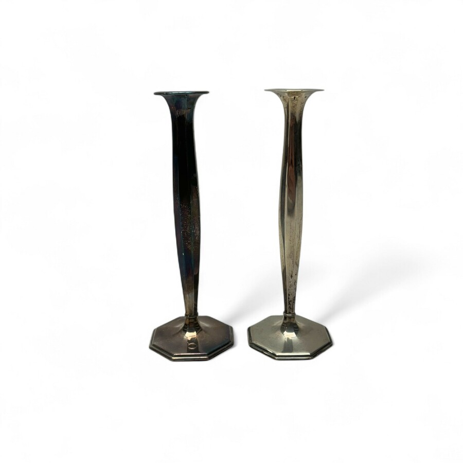 Twee tweede gehalte zilveren bloemenvaasjes, vergelijkbaar ontwerp met gefacetteerde stam, staand op achtkantige voet, beide gemerkt met zwaardje, waarvan één meesterteken: Van Kempen en Begeer,...