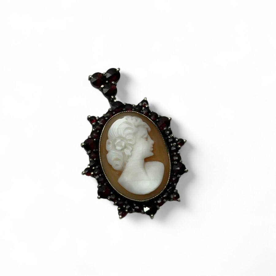 Een 20e eeuwse zilveren hanger met centraal een camee, omringd door gefacetteerde granaat. Ongemerkt, vermoedelijk Tsjecho-Slowakije.